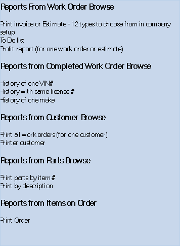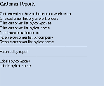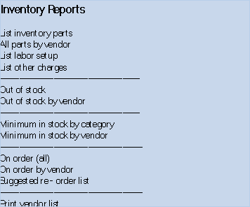 A total of apx.144 reports give you information about your customers, inventory, items on order, work orders and cash files. Only a few are shown.